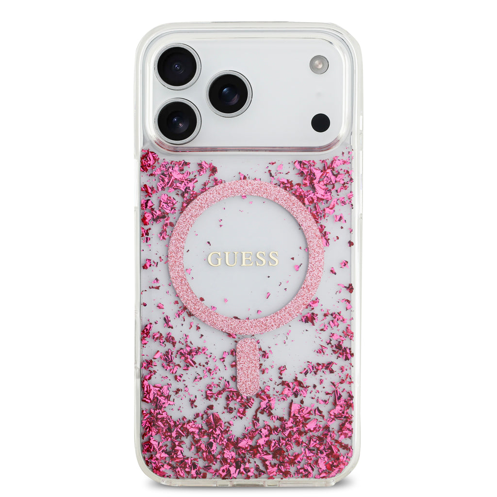 In the center, there is an eye-catching pink MagSafe ring with the Guess logo, emphasizing the prestige and luxurious style of this collection.